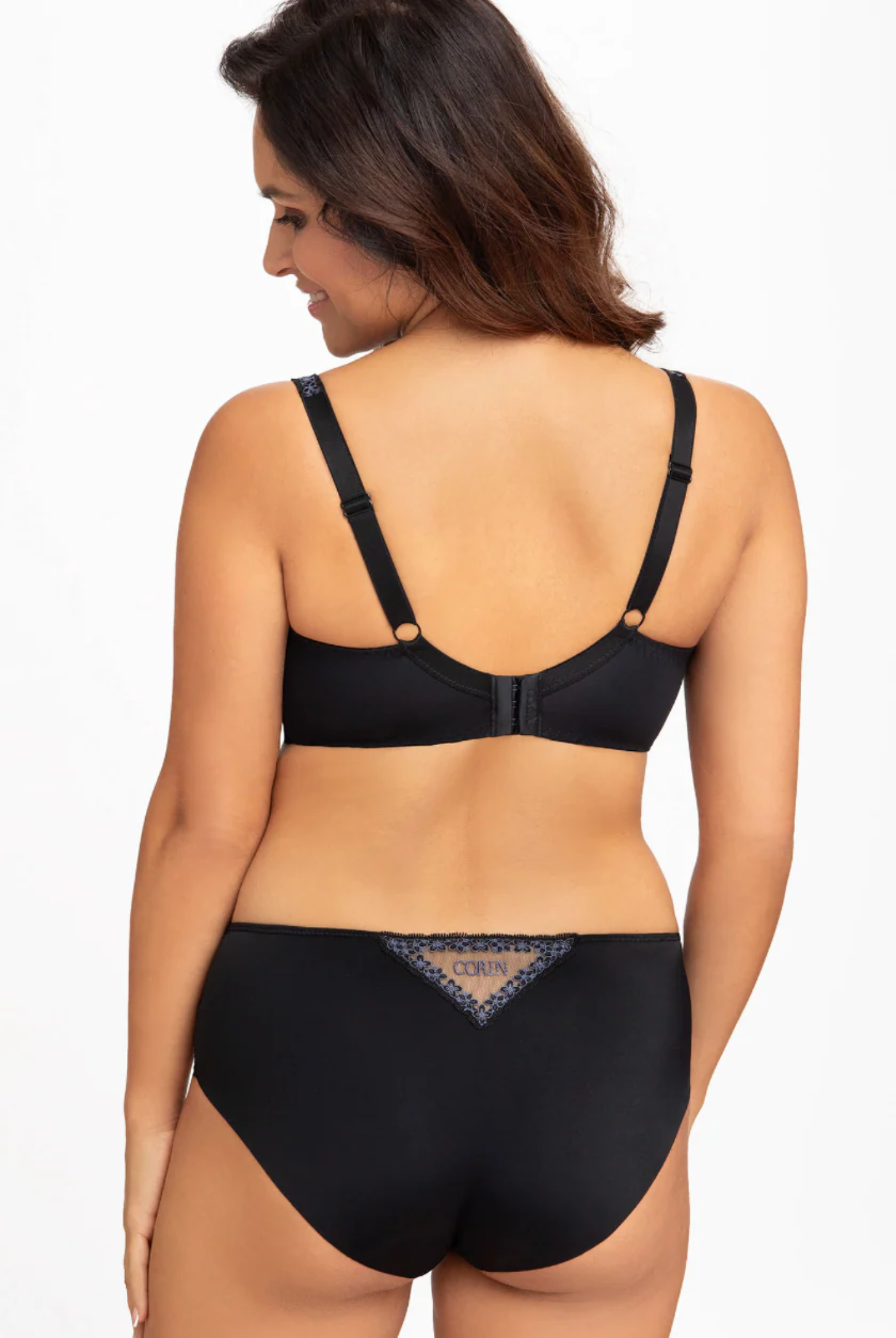Ce magnifique soutien-gorge à bonnets souples brodé de notre marque Corin est magnifiquement conçu pour un ajustement parfait. Les bonnets sont entièrement en tulle noir, brodés de fils bleu marine et noir. Le bas des bonnets a été renforcé par une couche supplémentaire de tulle pour mieux froncer, soutenir et relever la poitrine. Le soutien-gorge est doté de larges bretelles et d'une bande souple.